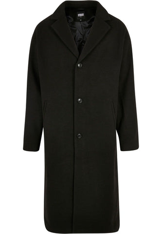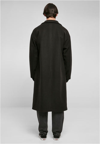A men’s coat with an oversized, modern fit featuring extended shoulders and a wide lapel collar. It includes an inner pocket and two piped outer pockets for a clean, masculine look. The coat is taffeta-lined and falls below the knee.